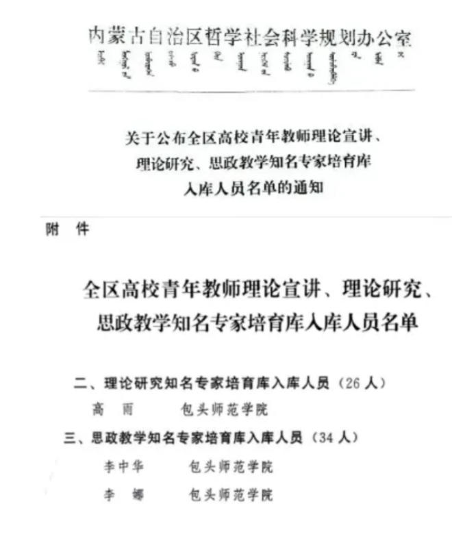 近日,根据内蒙古自治区党委宣传部、自治区教育厅《关于公布全区高校青年教师理论宣讲、理论研究、思政教学知名专家培育库入库人员名单的通知》,我校马克思主义学院教师李中华、李娜入选思政教学知名专家培育库;高雨入选理论研究知名专家培育库。